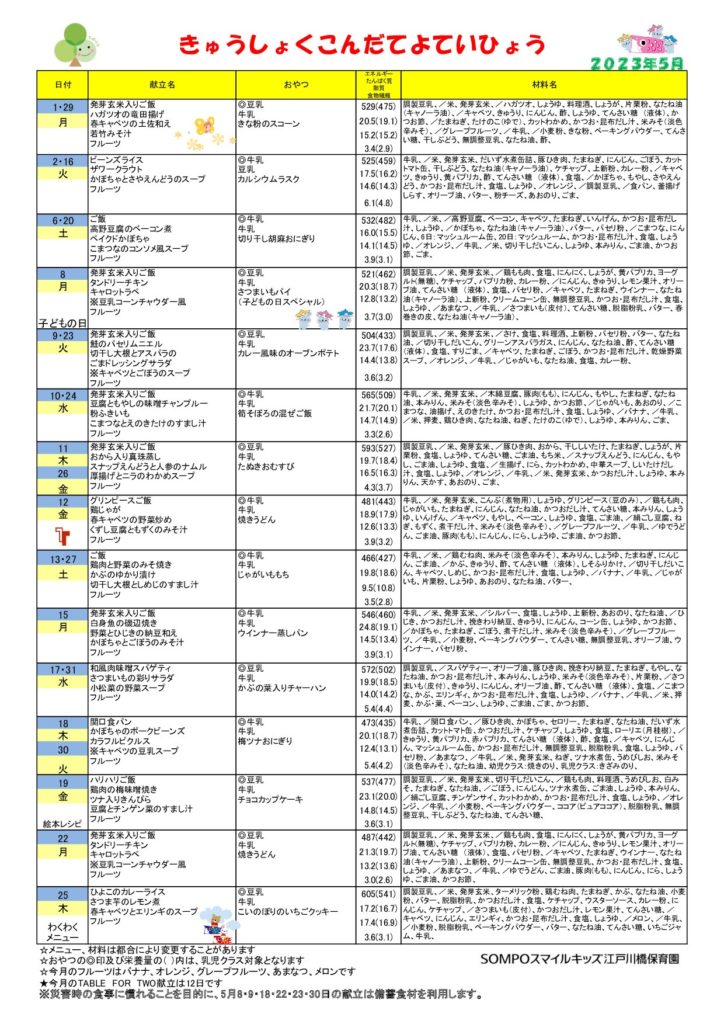 2023年5月の給食献立をお知らせ致します。