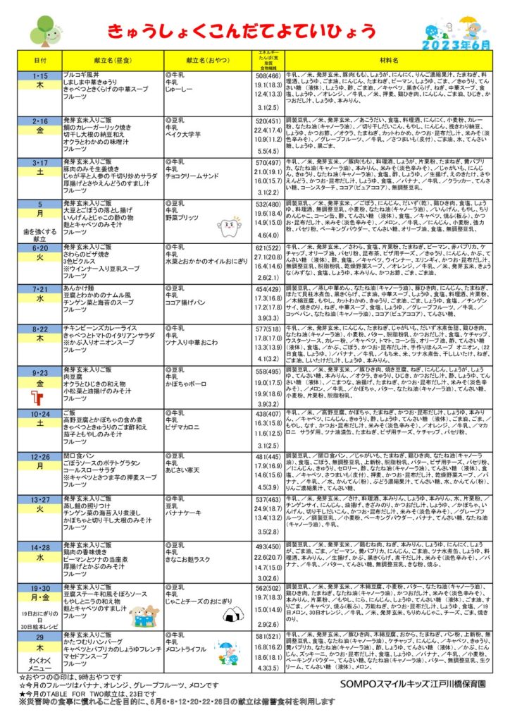 2023年6月の給食献立をお知らせ致します。