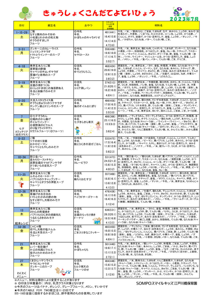 2023年7月の給食献立をお知らせ致します。
