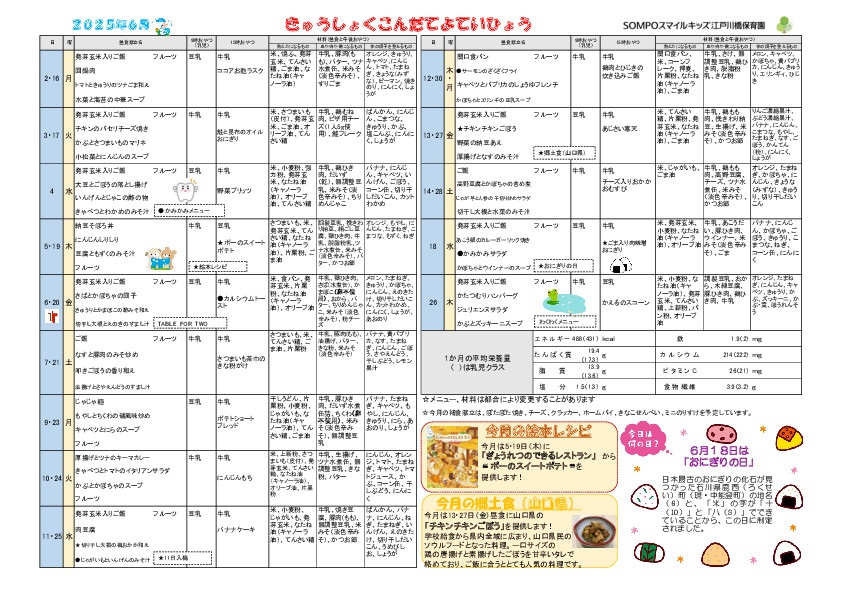 また、11日は入梅メニュー、13・27日は郷土食(山口県)、18日はおにぎりの日、26日はわくわくメニューです。