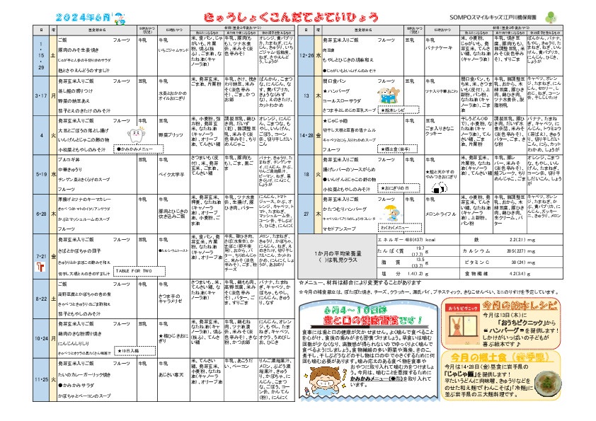 また、13・27日がTABLE FOR TWO献立、22日はカフェテリア給食(夏祭り)、29日はわくわくメニューです。